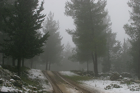 Through the spiked branches and snapped joints of the evergreens,