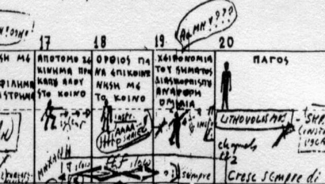 At the end of the film, a complex tape piece is playing, one with overlapping recorded voices and electronics. We are watching an old-fashioned tape player running, clearly playing the piece. A paragraph on the screen explains: this tape piece was left unfinished at Christou's death, it is not possible to finish it, it breaks off in the middle of a phrase –