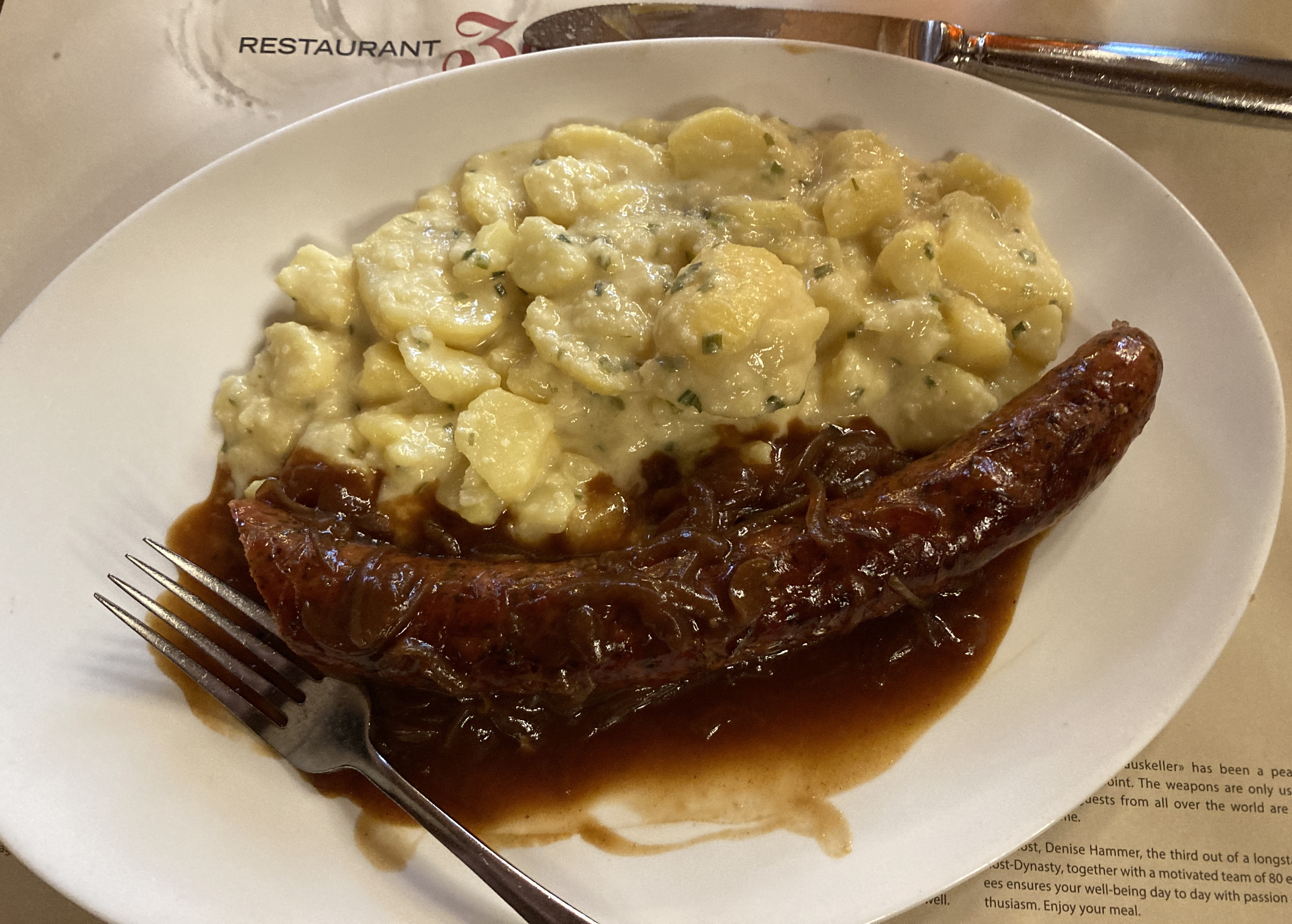 Then a good solid lunch in an energetic restaurant, a large, bustling open space filled with tables filled with people, and good solid Swiss food. I had the Zwingli sausages and potatoes… hmm. No twinges of reformation, on my part at least.